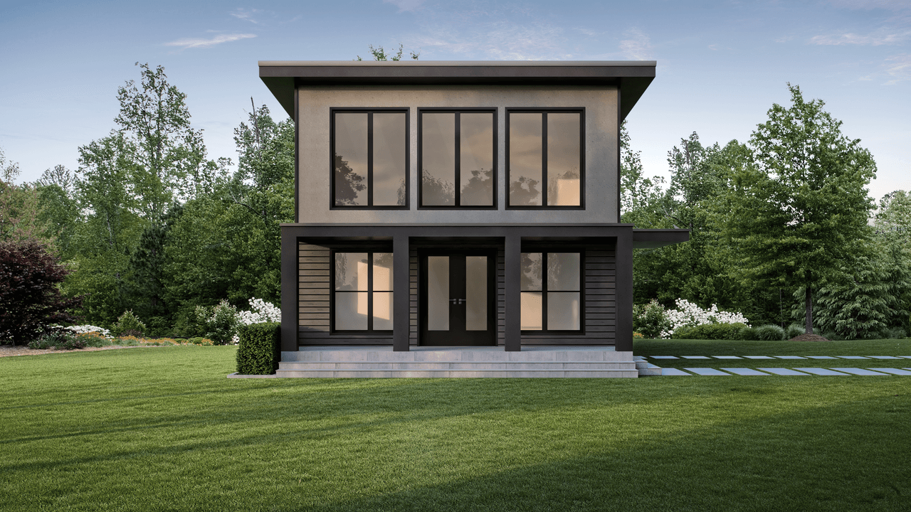 Model 6 – Two level ADU or Tiny home features great room, kitchen and bedroom #2 and bath on main level with bedroom #1 and a bath overlooking main level great room from the upper level.