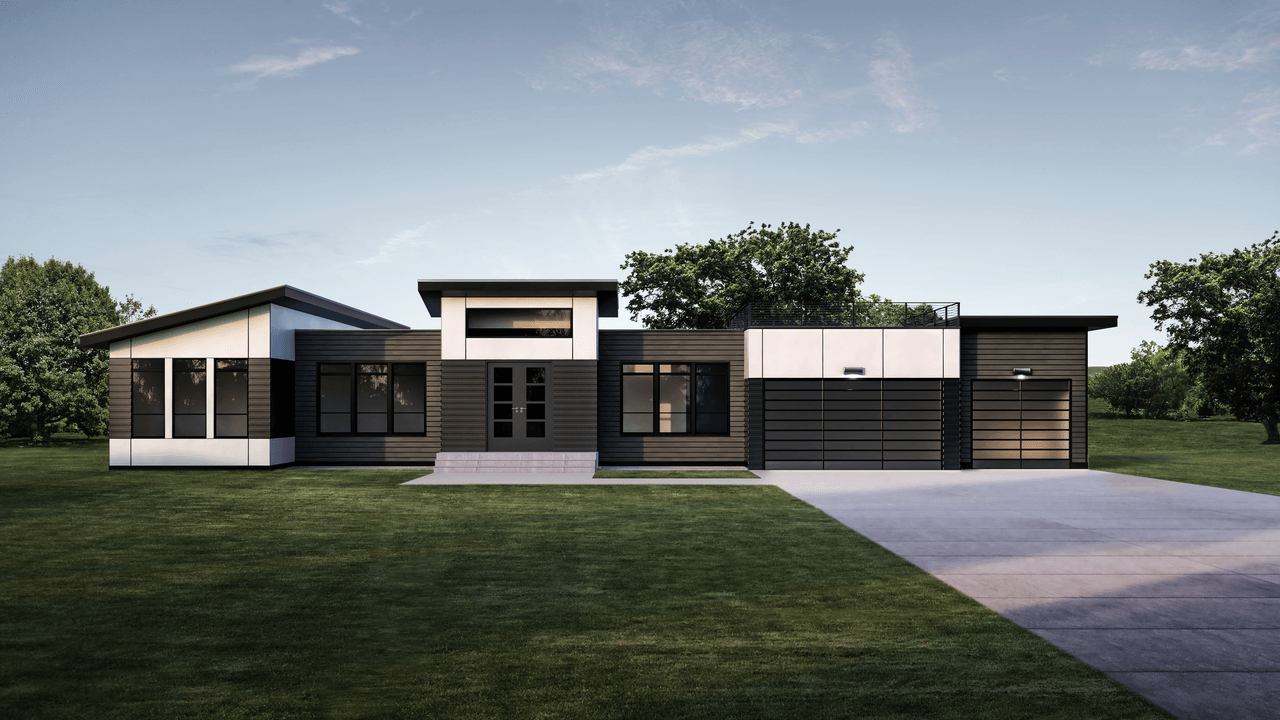 Model 29 – Contemporary style family home features sprawling center of plan great room with panoramic doors to large rear deck, entry tower, exterior access to garage deck, large master bedroom suite, king size secondary bedrooms, double door entry to office in foyer.