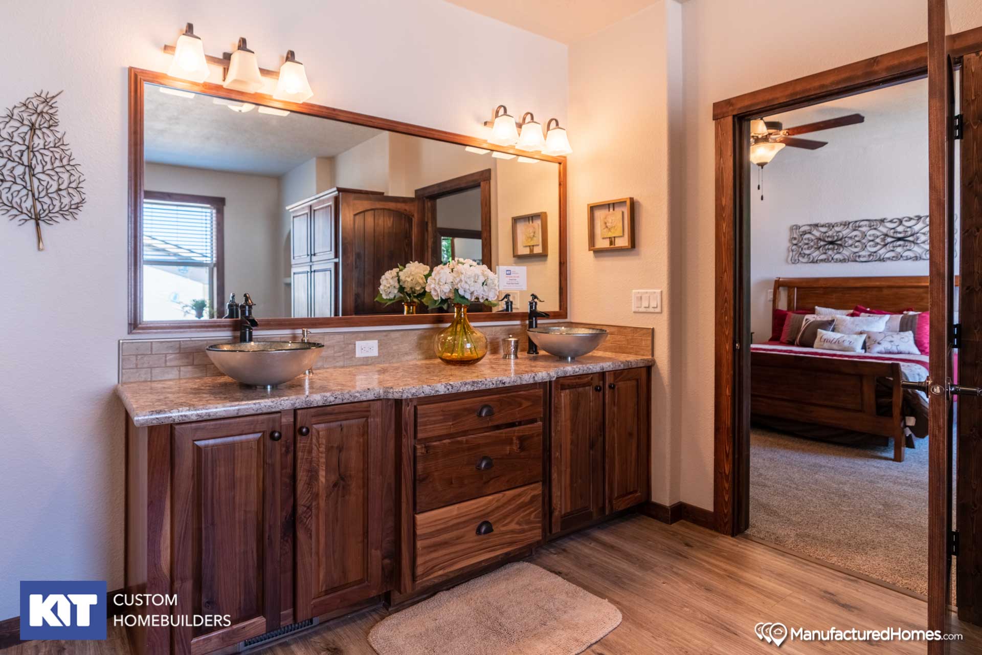 Bathroom Mirror: Full Width Mirror w/Wood Trim Around (matches cabinets)