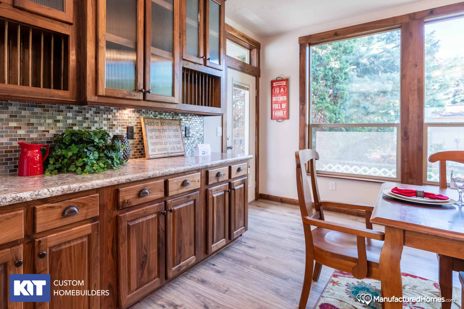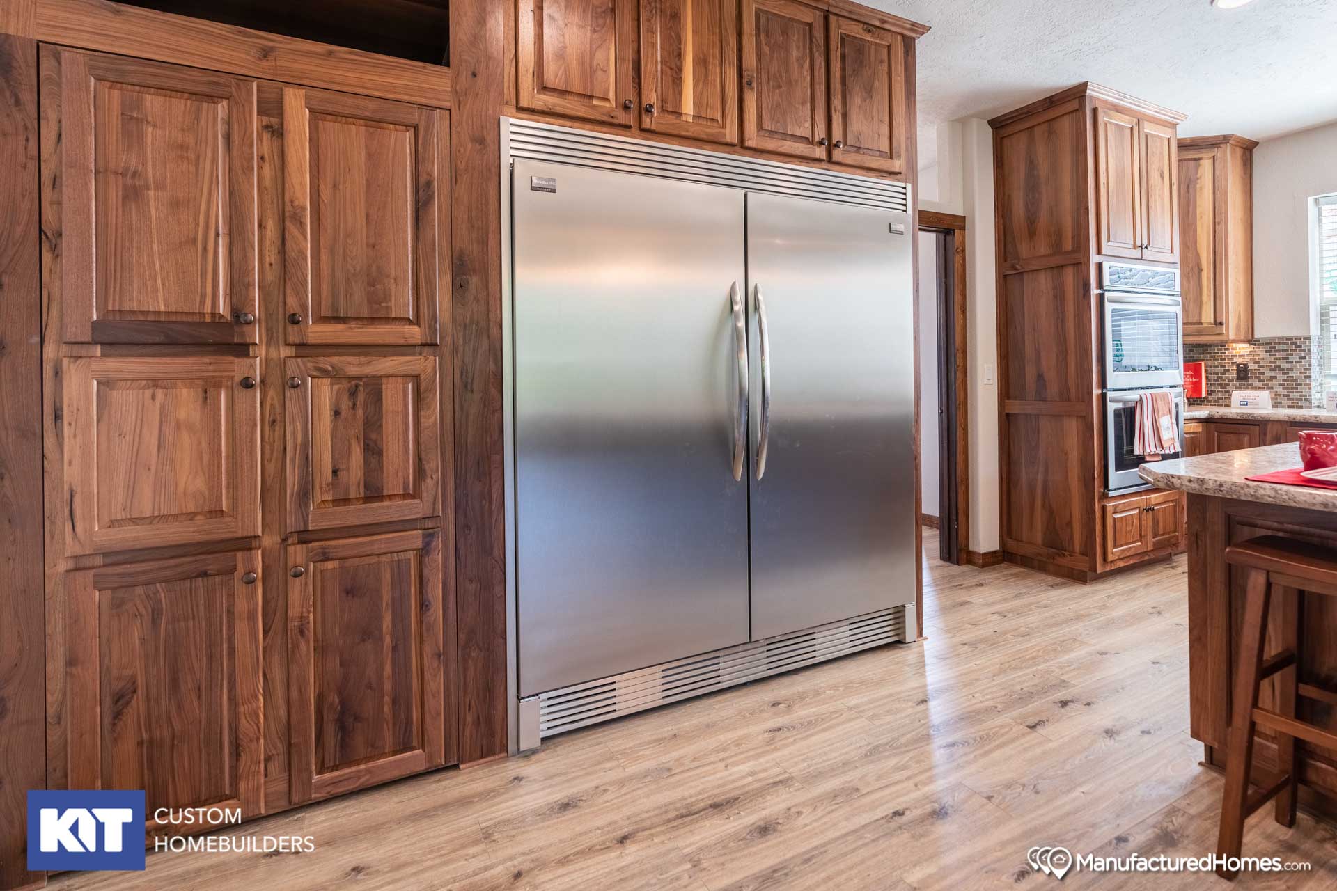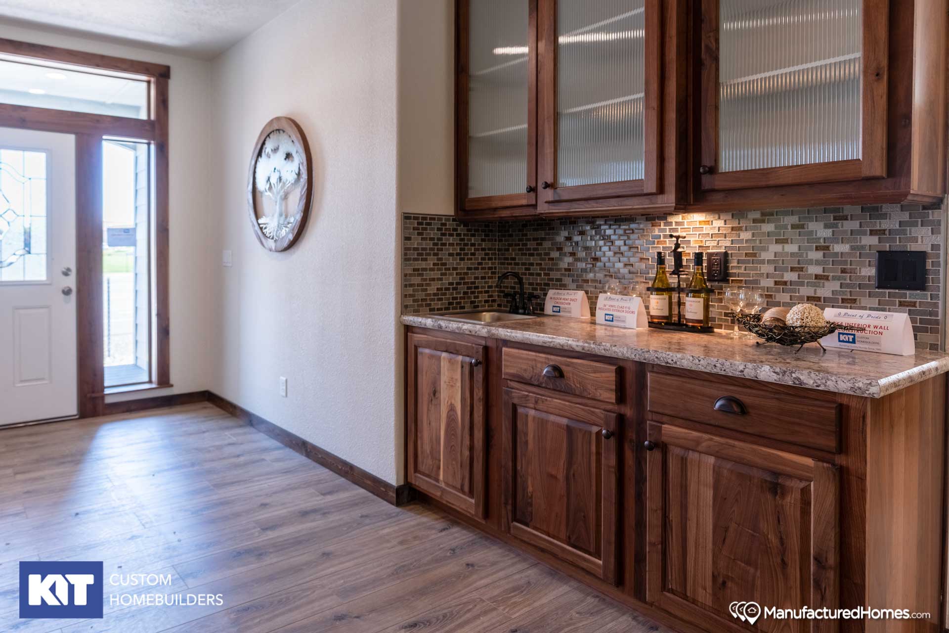 Kitchen Cabinetry: Natural Wood Cabinets & Doors / (2) Reed Glass Overhead Cabinet Doors / Satin Nickel Cabinet Door And Drawer Button Pulls / Drawer over Door Cabinet Construction / Deluxe Roller Bearing Drawer Guides / Hi-Lo Cabinet Design w/With Overhead Cabinet Crown Molding Throughout / 52”/31” Overhead Cabinets w/Adjustable Shelves / Cabinet Over Refrigerator