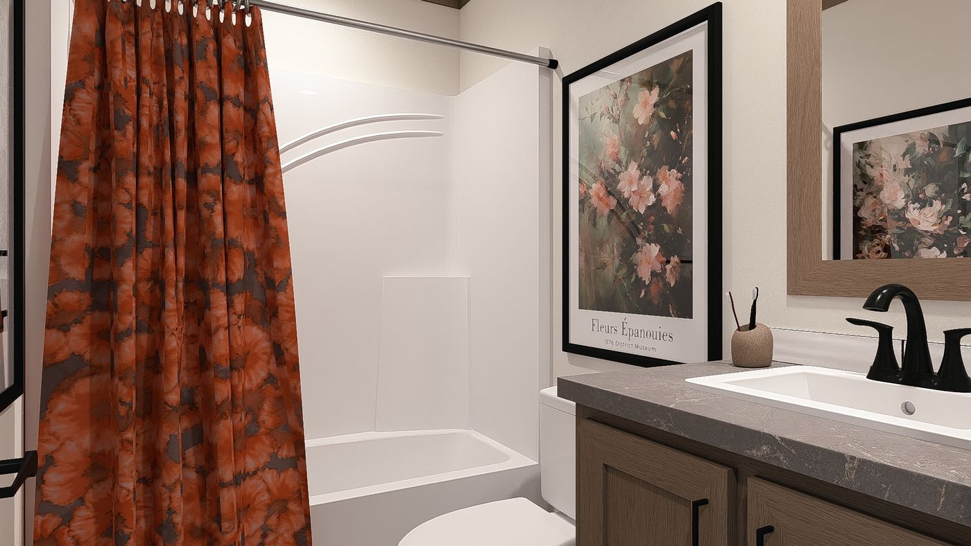 Bathroom Shower: 60” fiberglass shower with black pivot door in primary bath / 60” Fiberglass tub/shower combo in hall bath
