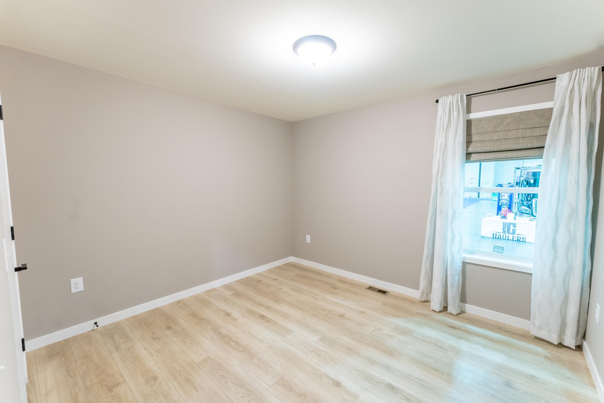 Molding: White flat stock 2” case molding at windows and doors / White flat stock 3-1/2” base molding throughout