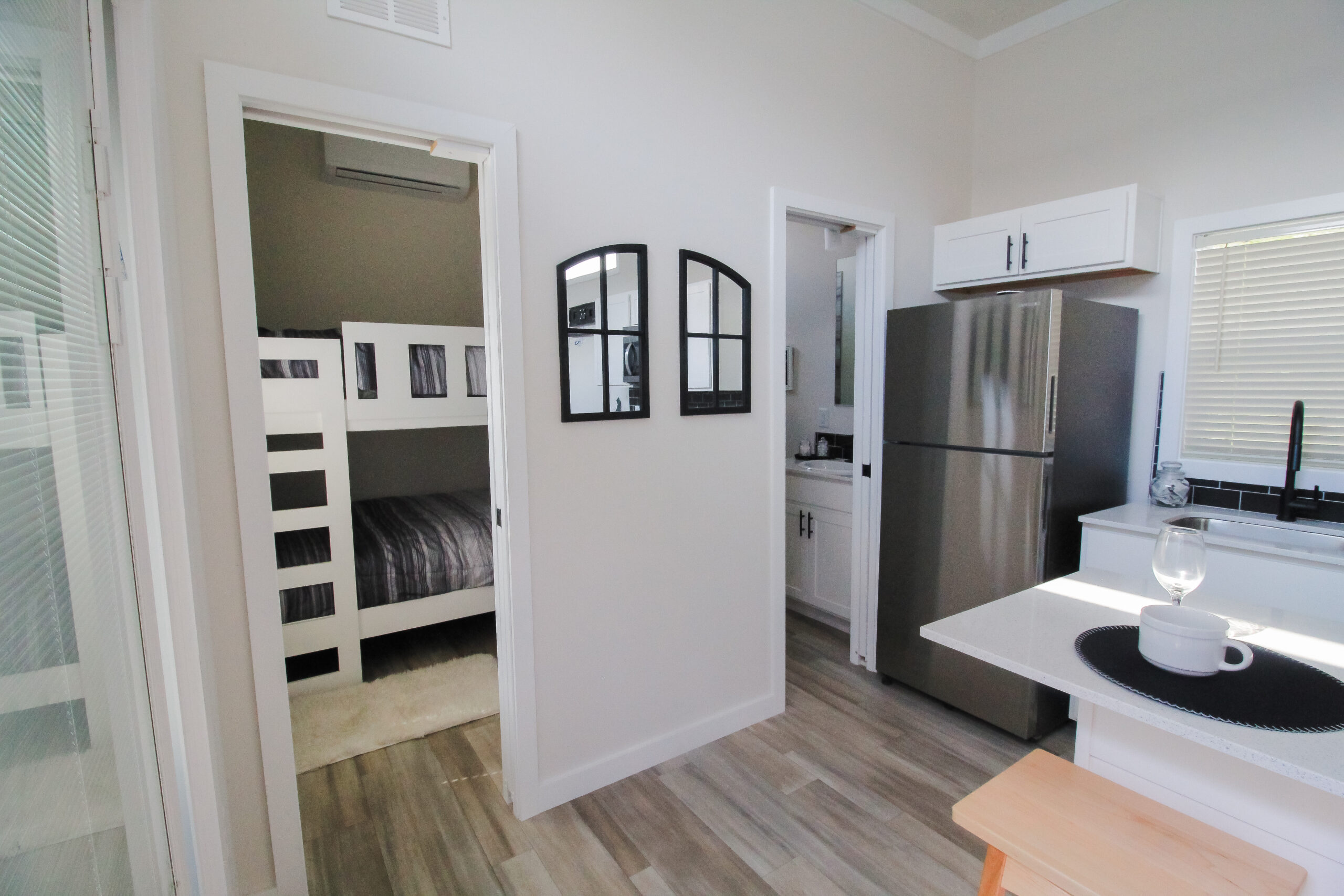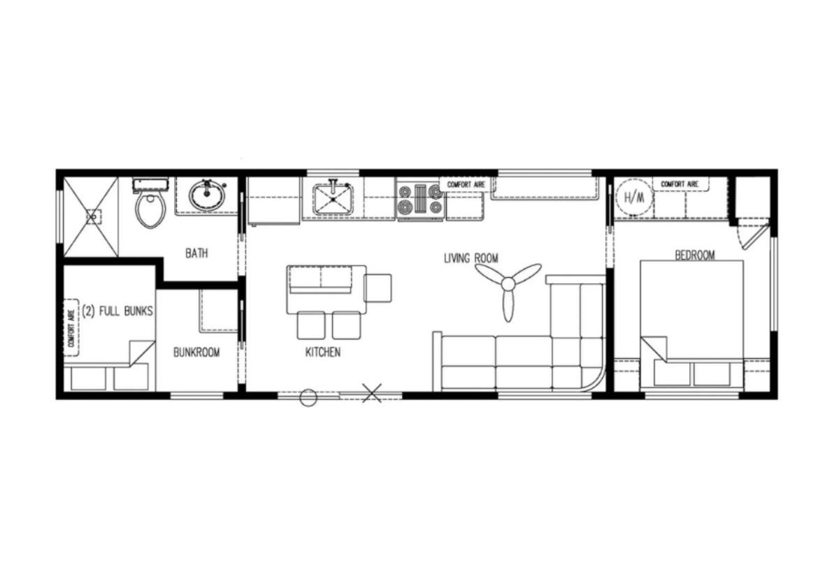 The Great Outdoor Cottages / Escape 210 built by Great Outdoor Cottages is a smart, adventure ready retreat designed for comfort and fun. With 399 square feet, 2 bedrooms, and 1 bathroom, The Escape 210 makes the most of every inch. The open kitchen flows into a cozy living room, creating a bright space to relax after a long day outdoors. A private bedroom offers quiet rest, while a bunkroom with full bunks adds extra sleeping space for family or friends. The Escape 210 is the perfect blend of charm, function, and easy getaway living.