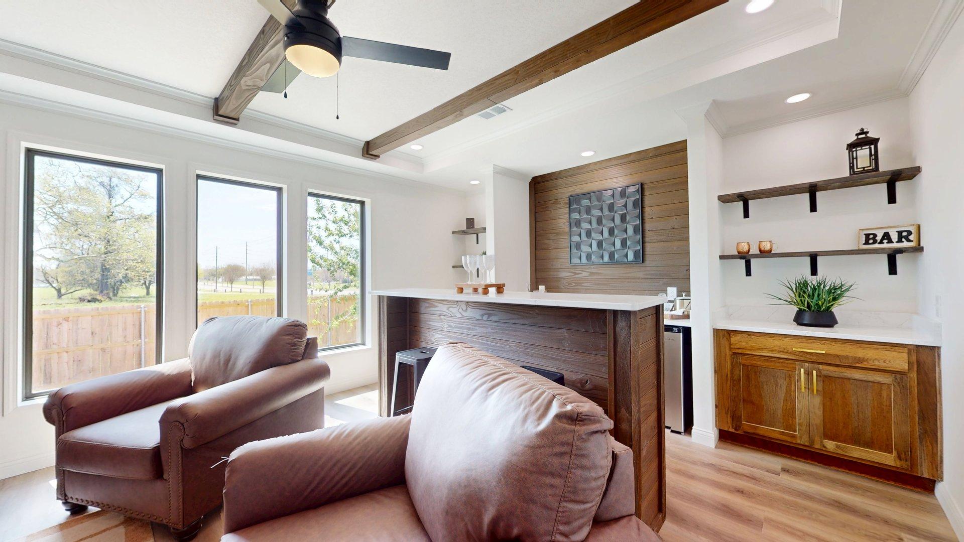 The living areas are expansive and inviting, anchored by an all-new fireplace and custom bookcase that create a true focal point for gatherings. A dedicated theatre room takes movie nights and game days to the next level, while the standout feature—the Churchill Bar wet bar—adds a level of sophistication and fun rarely seen in factory-built homes.